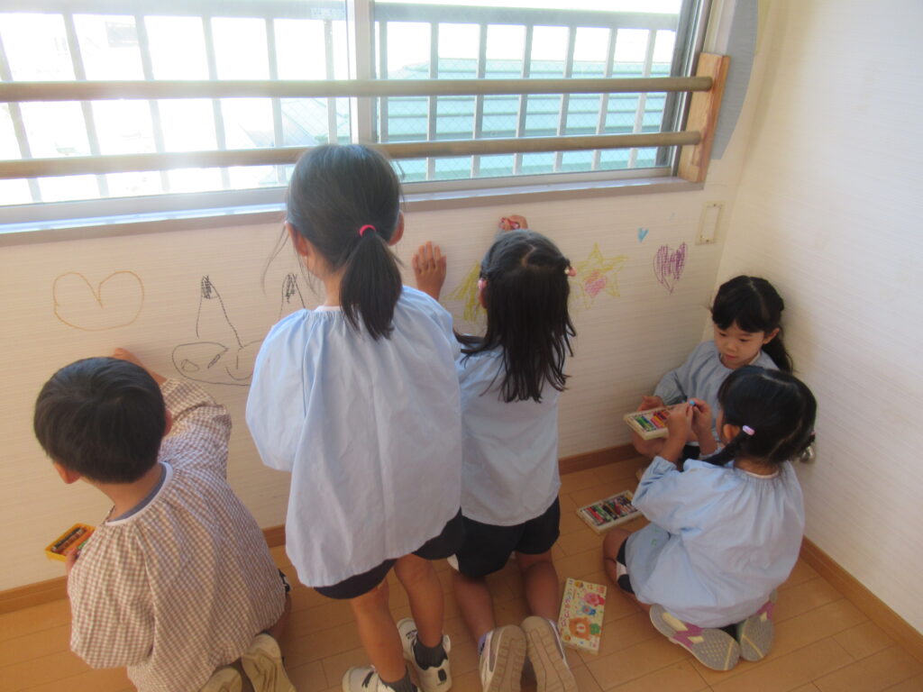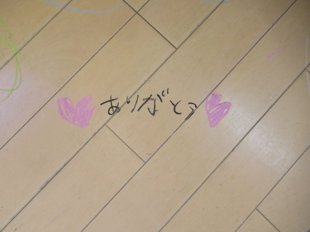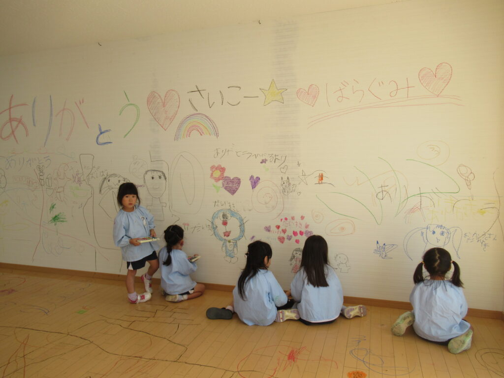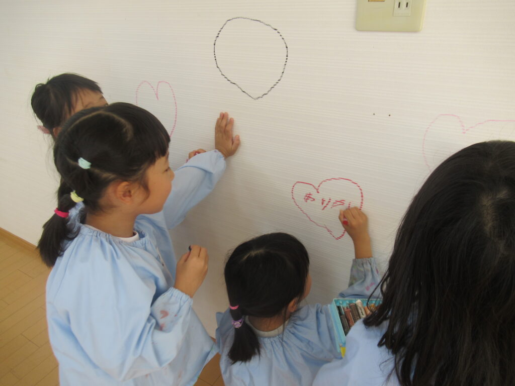 前いた園舎の保育室にありがとうの気持ちを込めて床や壁にクレヨンでメッセージを書いたり、お絵描きをしたよ!