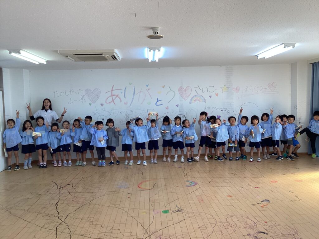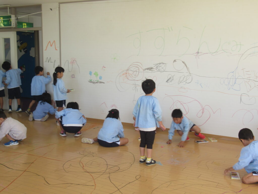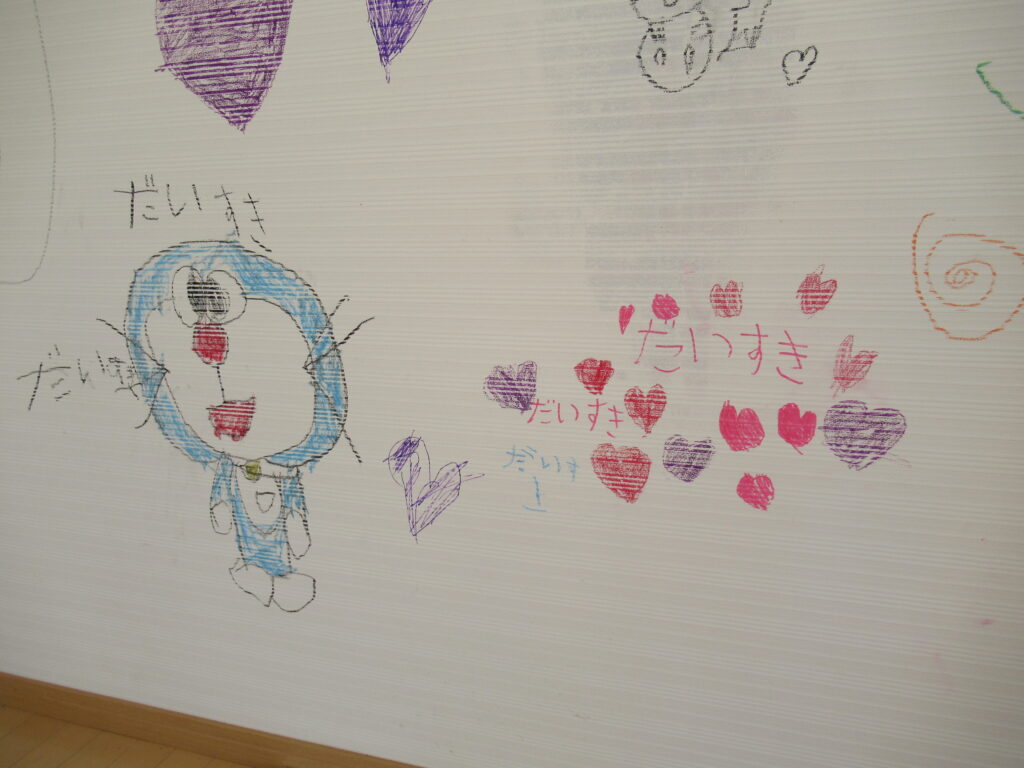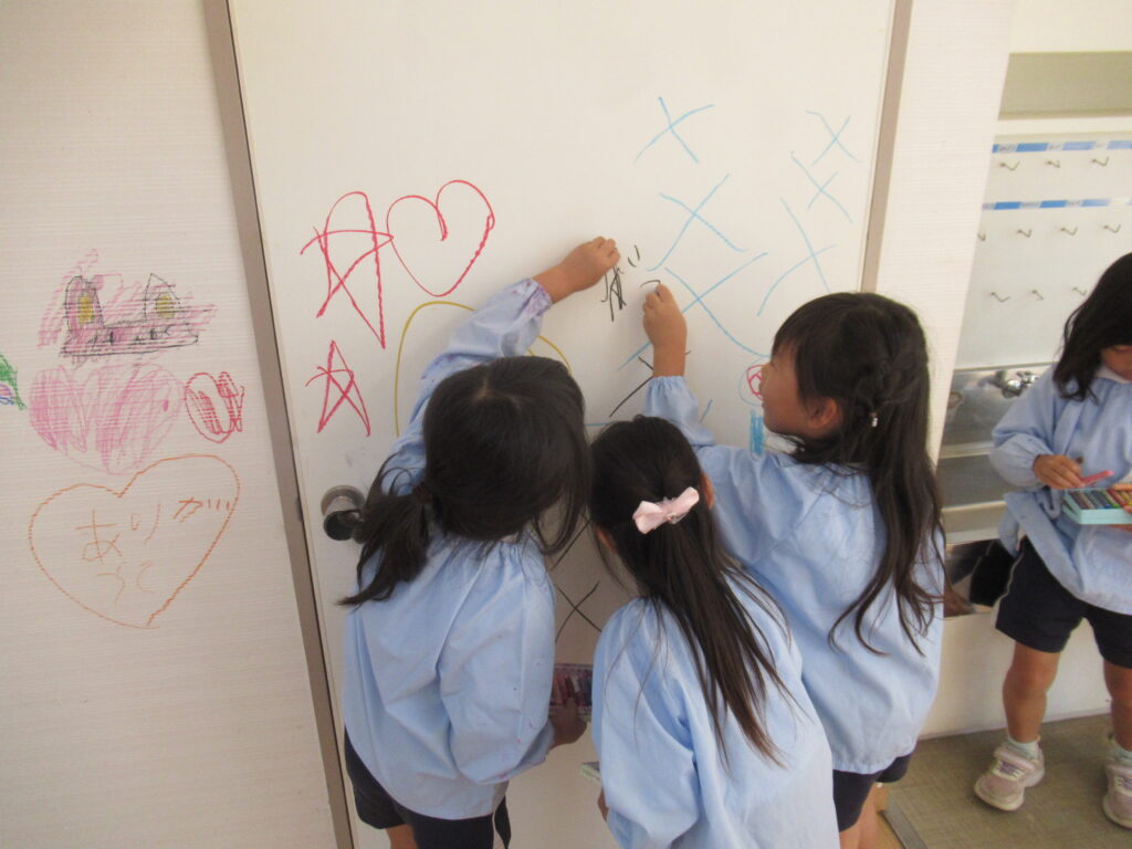 前いた園舎の保育室にありがとうの気持ちを込めて床や壁にクレヨンでメッセージを書いたり、お絵描きをしたよ!
