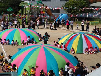 4歳児クラスの皆は、今まで繰り返してきたパラバルーンの技を保護者の方にも披露することが出来ました。