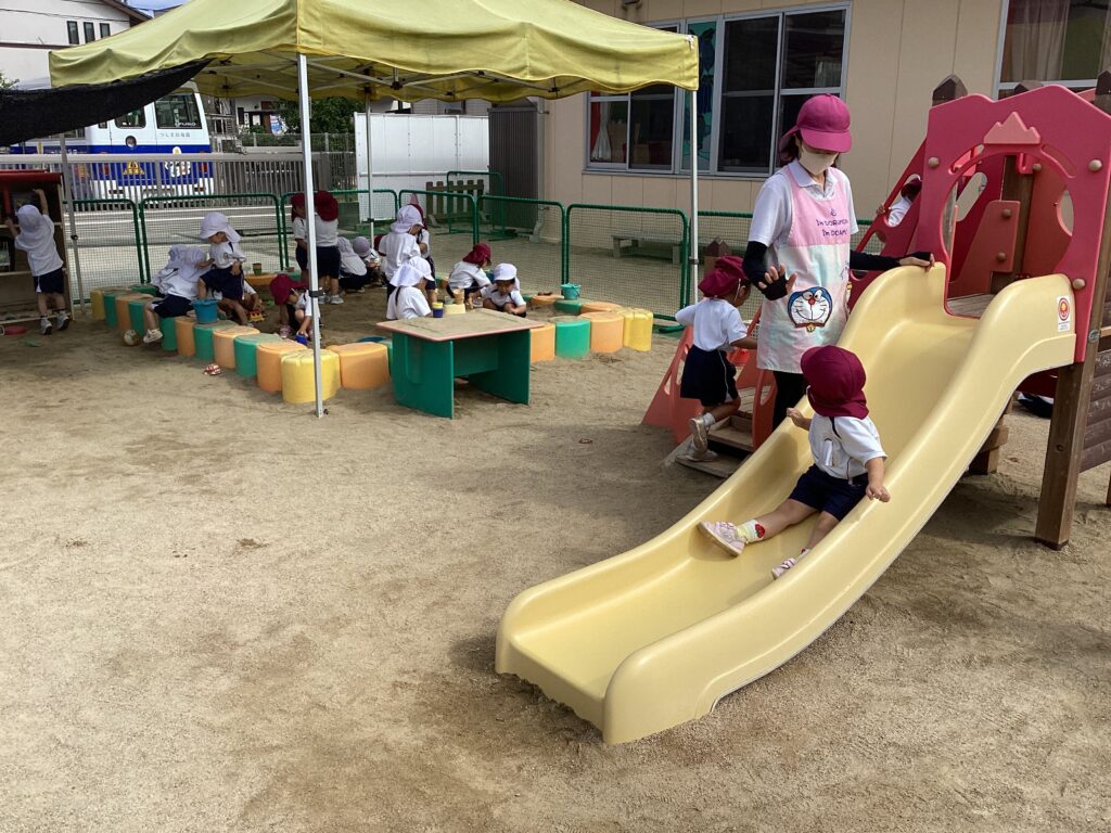 滑り台を楽しそうに滑ったり、砂場でお山を作ったりしたよ!