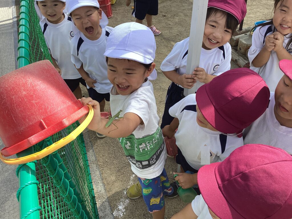 カマキリを見つけて大興奮!