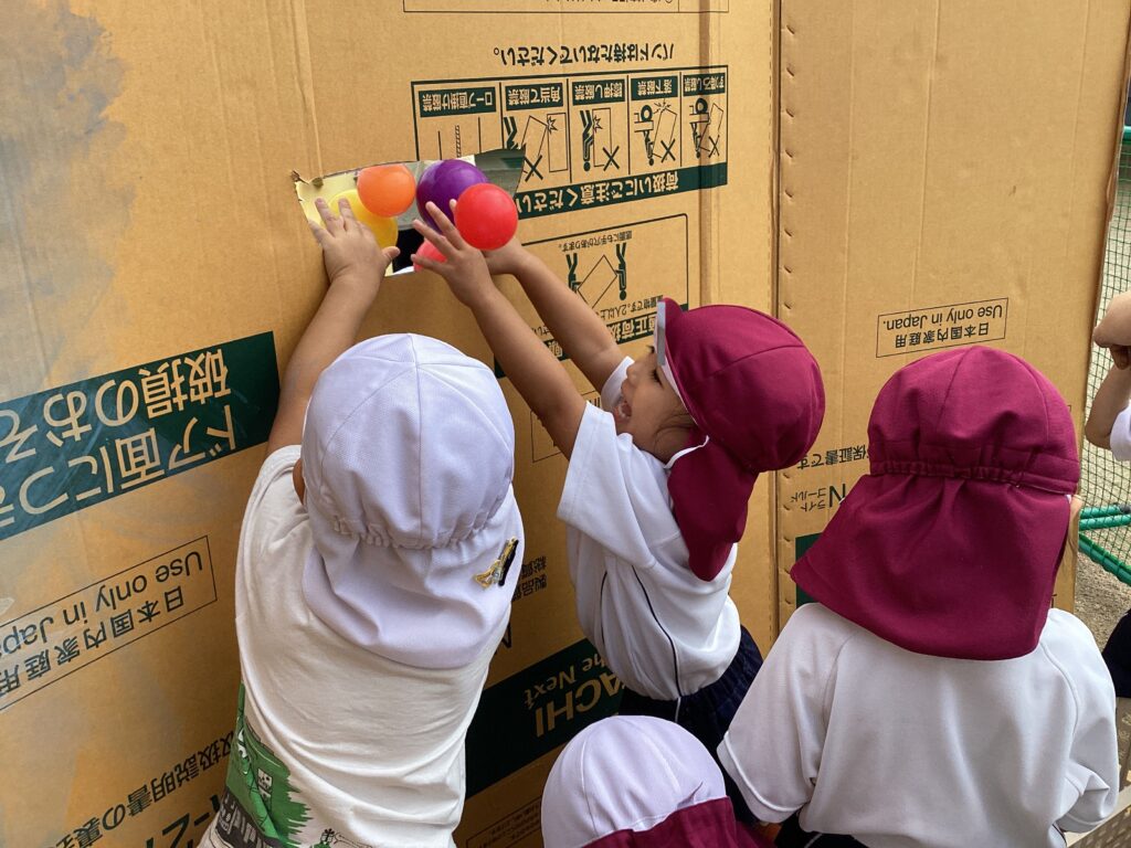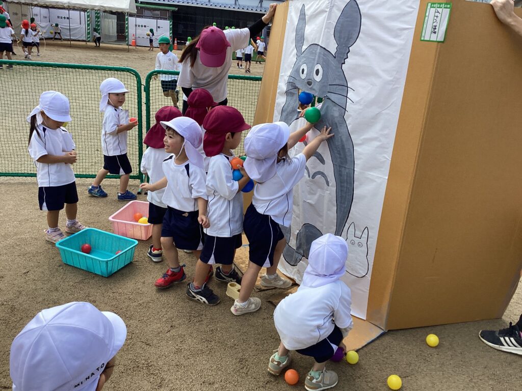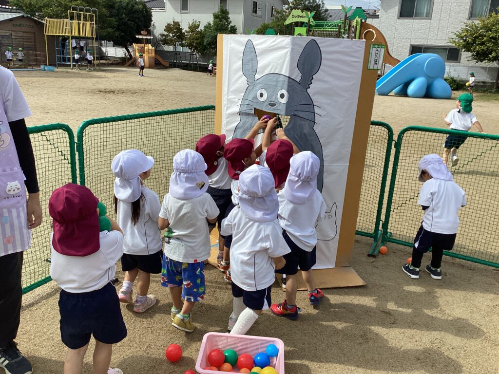 運動会で使った大きなトトロのお口にボールを入れて遊びました。