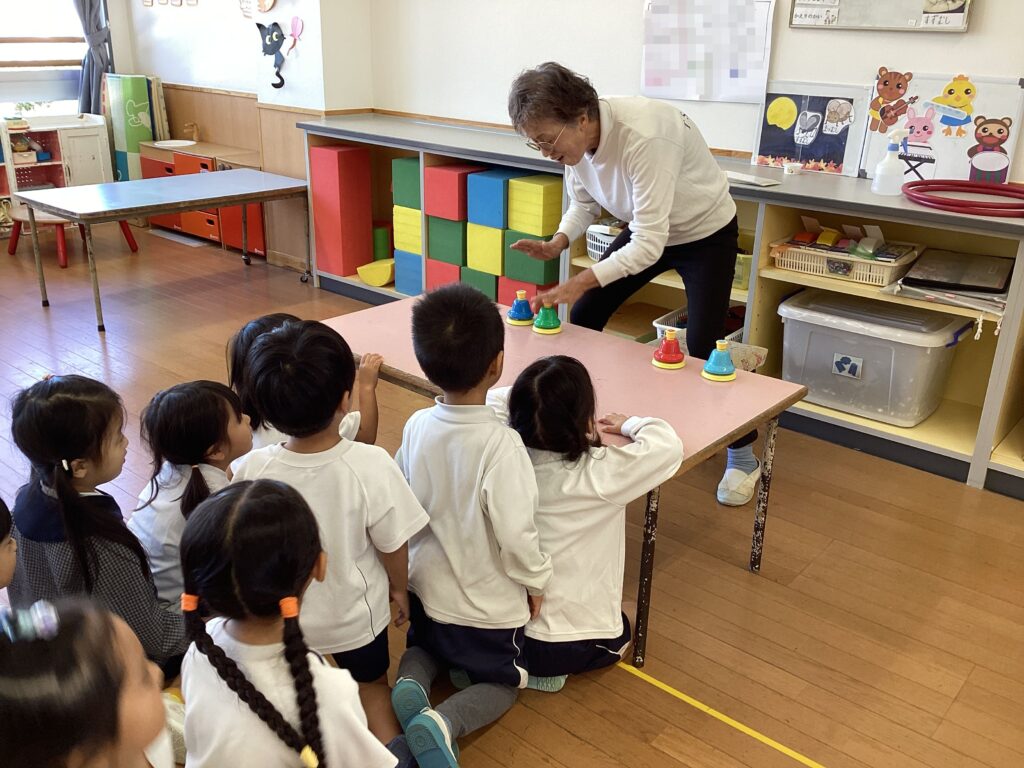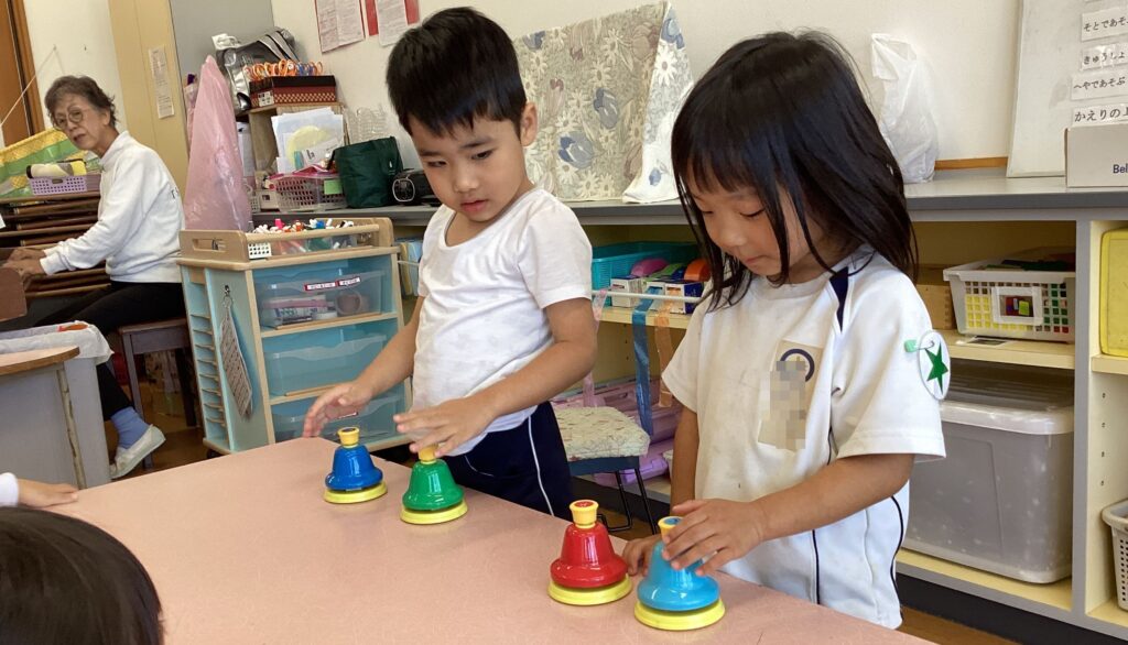 そして、「コオロギ」の曲に合わせて、メロディーベルを鳴らしました。チロチロリン、コロコロリンの歌詞に合わせてメロディーベルで鳴き声を表現しました。
