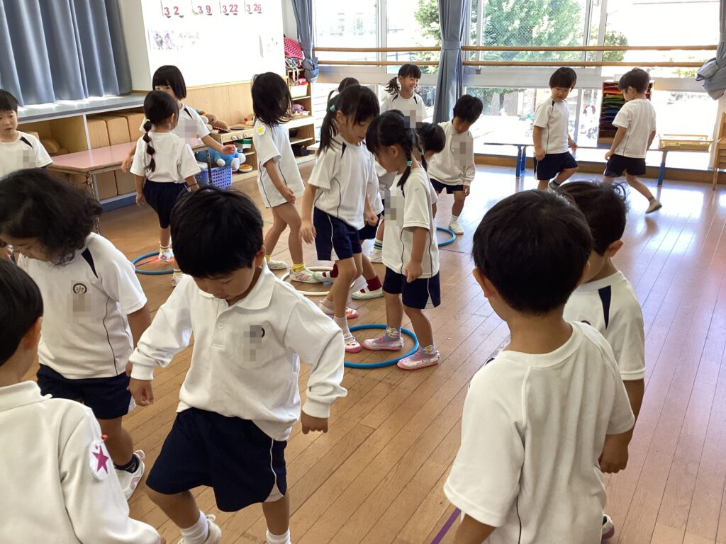 今月は、お友だちとペアになって3拍子の曲に合わせて活動をしました。友だちと向き合って手を合わせたり、フラフープに足を出したり入れたりして3拍子を楽しみました。
