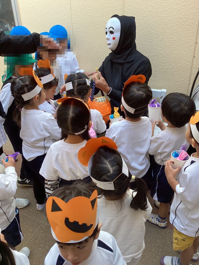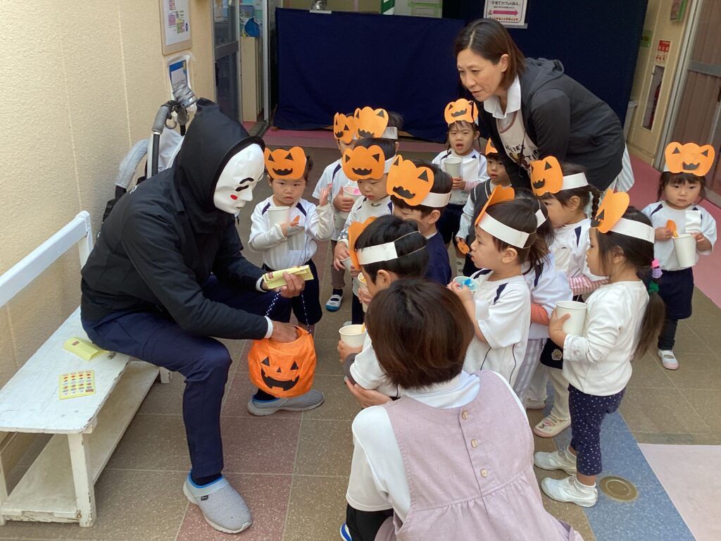 お面をかぶったおばけさんにちょっぴりビックリなあんず組さん。