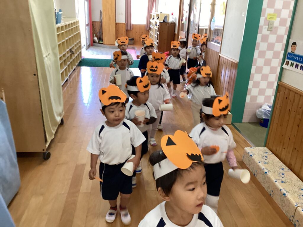 自分で作ったかぼちゃのお面をつけて、おばけさんを探しにしゅっぱーつ!