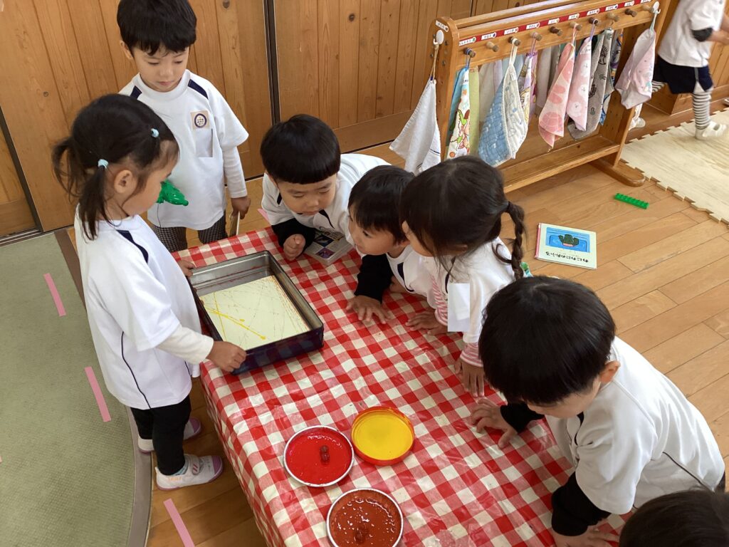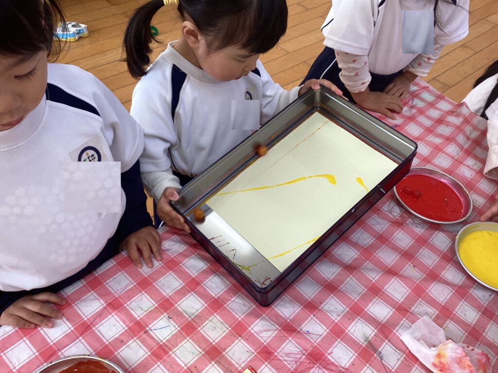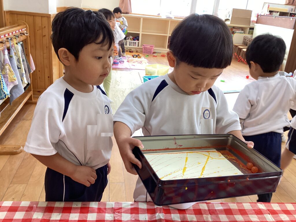 赤、茶色、黄色の色が付いたビー玉を画用紙にコロコロ転がして素敵な模様をつけました!