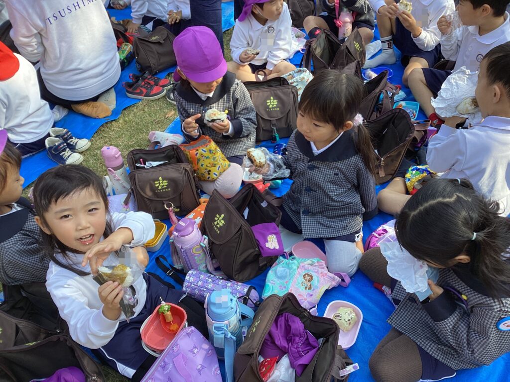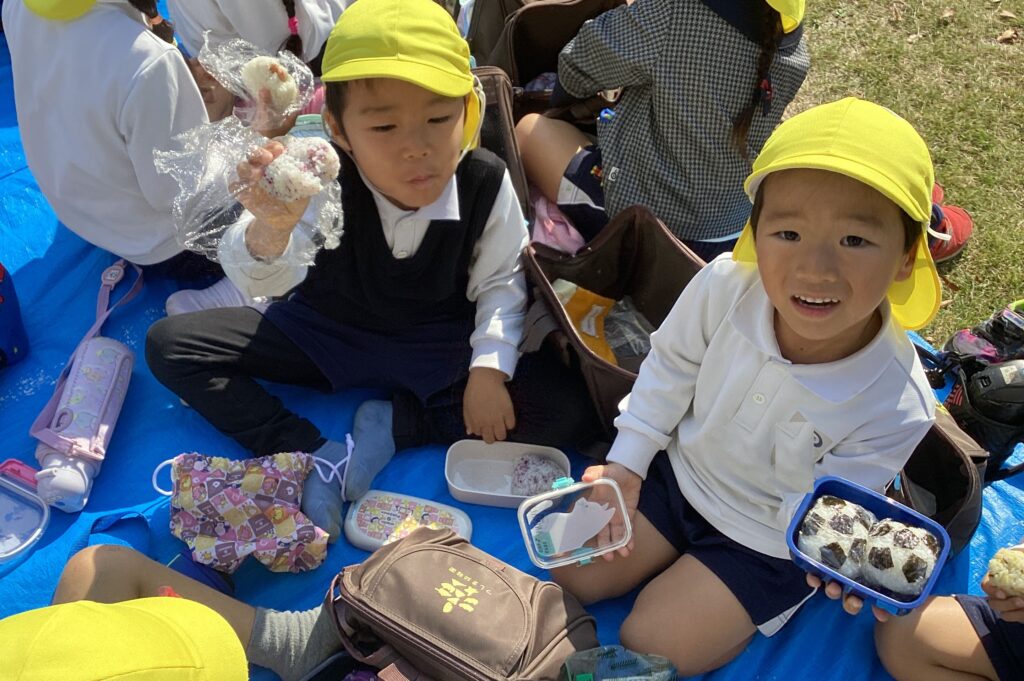 たくさん歩いてお腹がすいたら、運動公園にいって、おうちの方に作ってもらったおにぎりを食べました。