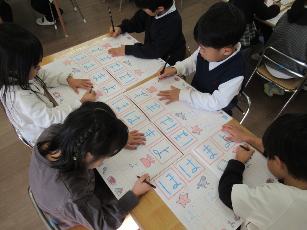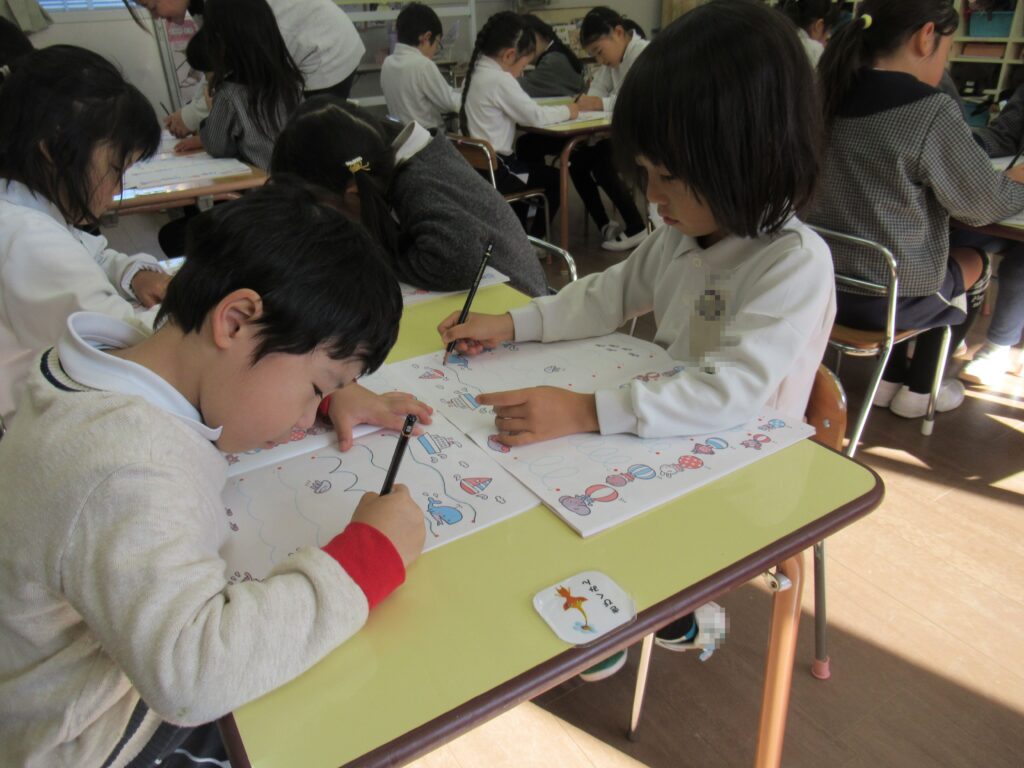 先生が指示する前に、「もう、ぐーぴたぴん出来てるよ!」「鉛筆もちゃんと持てるよ!」などの声が多く聞こえ、いきいきと楽しんで活動していました。