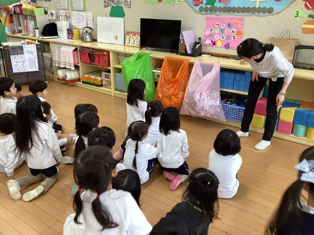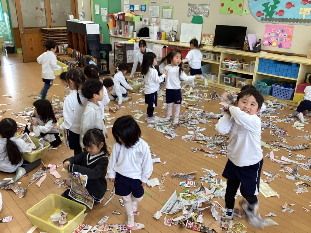 ちぎった新聞紙をばらまいてみたり、最後はクラスカラーの袋にどれだけ新聞紙を入れることができるかという競争もしました!