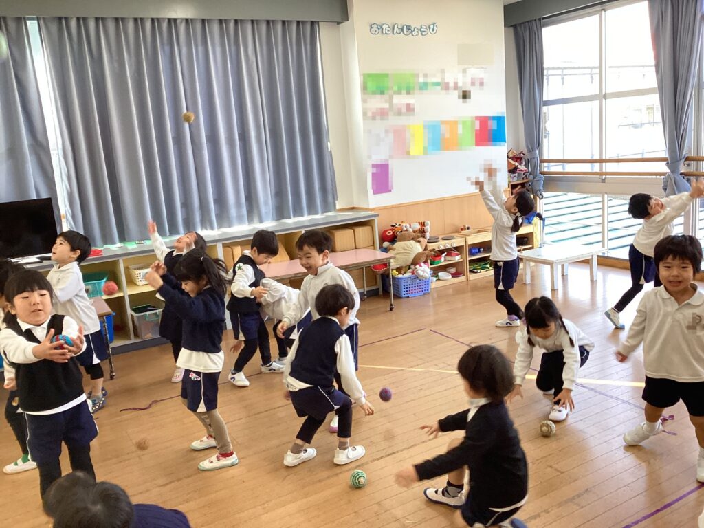 昨年度人気だった「にぎにぎさん」というお手玉を使って、音楽に合わせて子どもたちがペンギンになったりおもちになって二人組でお餅をついたりしました。