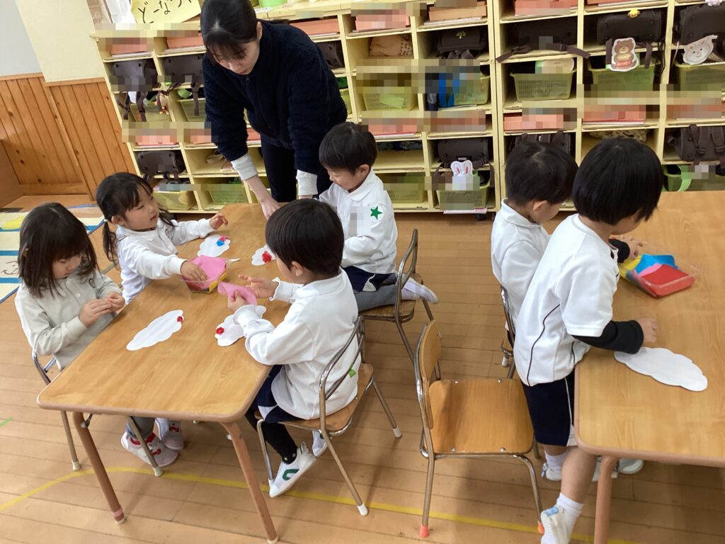 鬼のつのをハサミで切ったり、お花紙を丸めてつけたりしました!