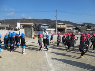 ぞう組、きりん組、ぱんだ組と対決をするときいて、それぞれクラスごとに「エイエイオー」と声を合わせ、気持ちを一つにして対決に臨みました。
