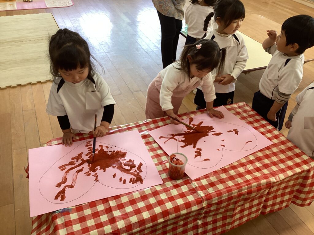 最初に、大きなハートを絵の具で塗りました!