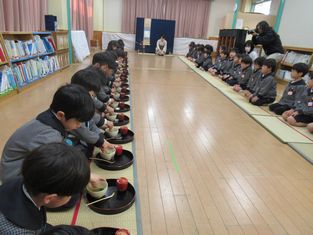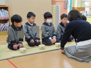 今日は、5歳児クラスの子どもたちが4紗児クラスの子どもたちにお茶の点て方を披露しました。