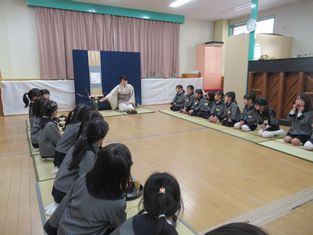 4歳児クラスの子どもたちは、畳の座り方やいい姿勢を見習っていました。