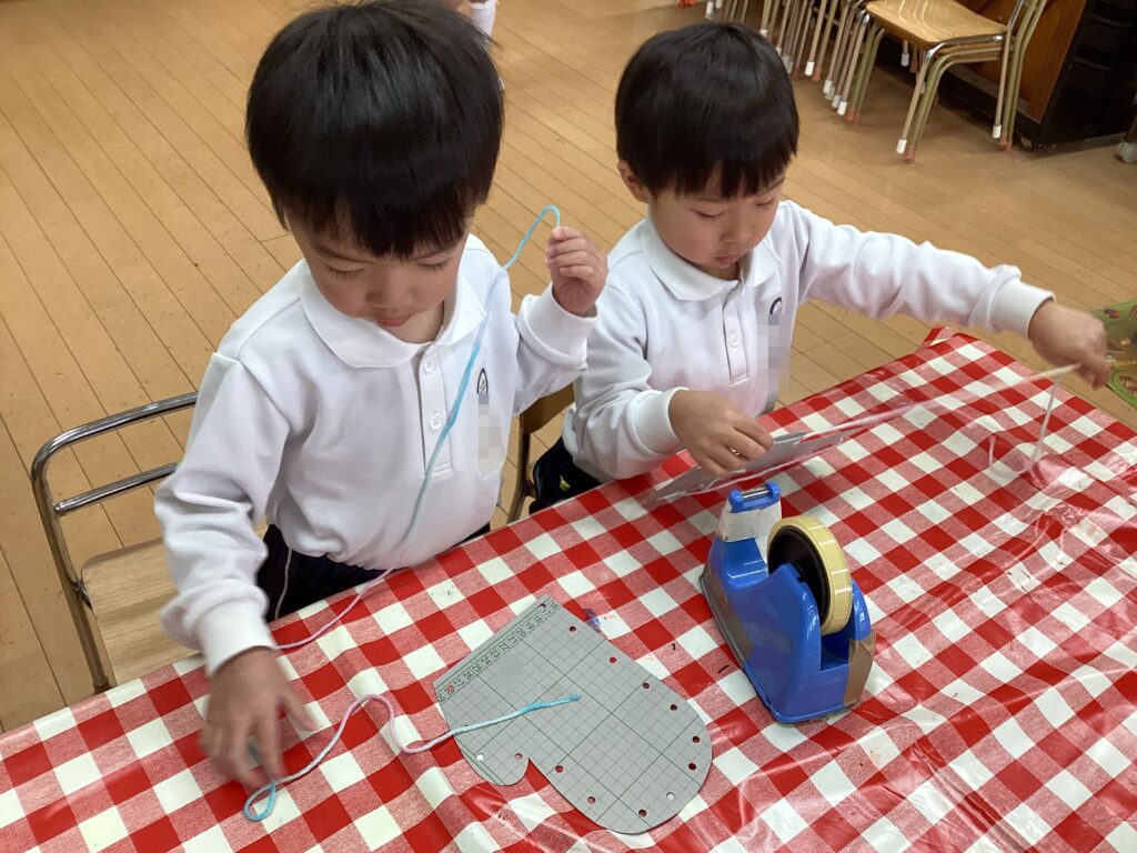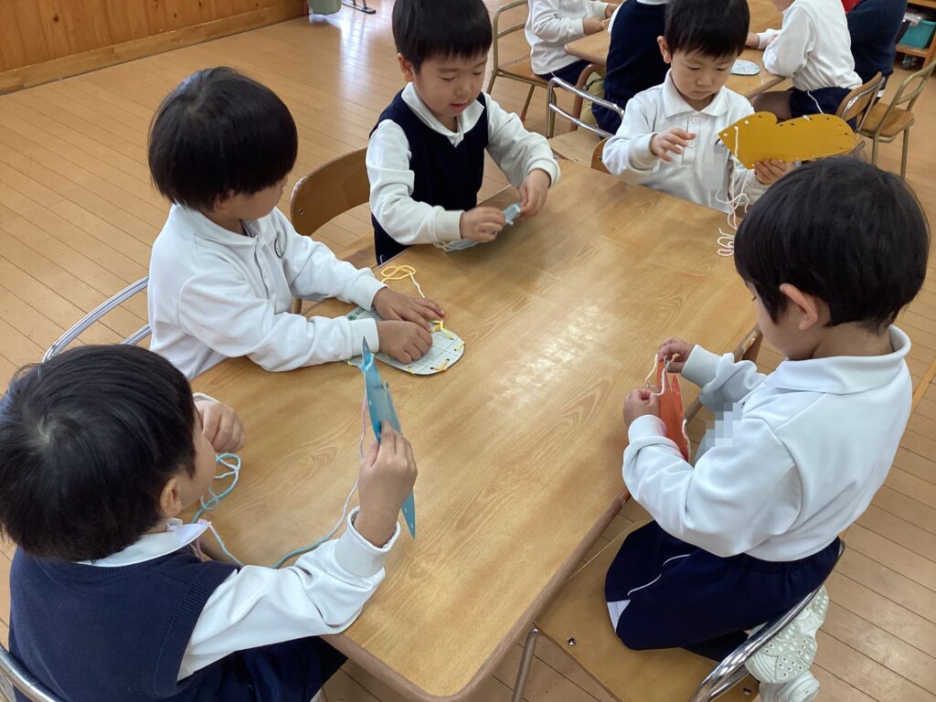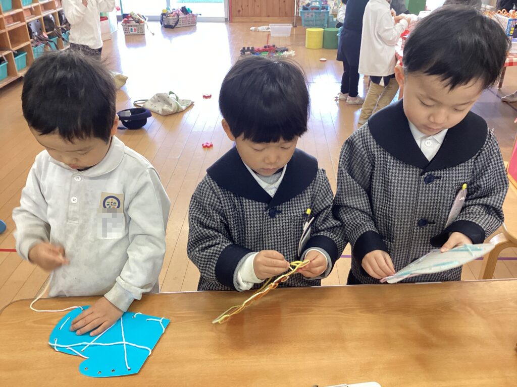 2月の思い出製作で手袋に毛糸でひも通しをしました!