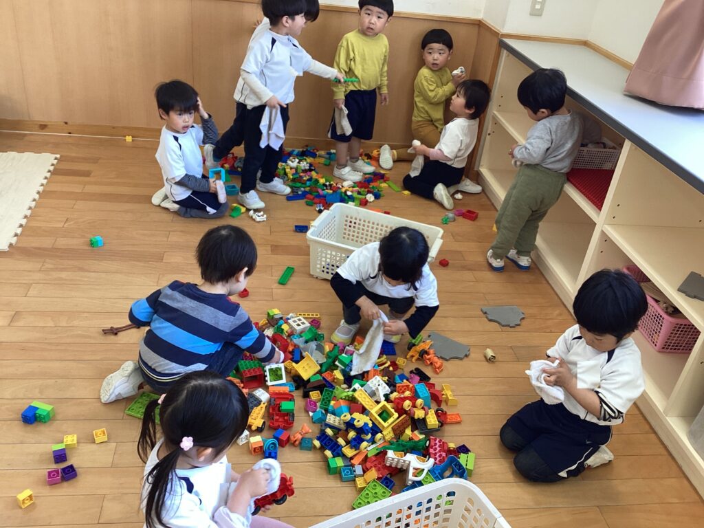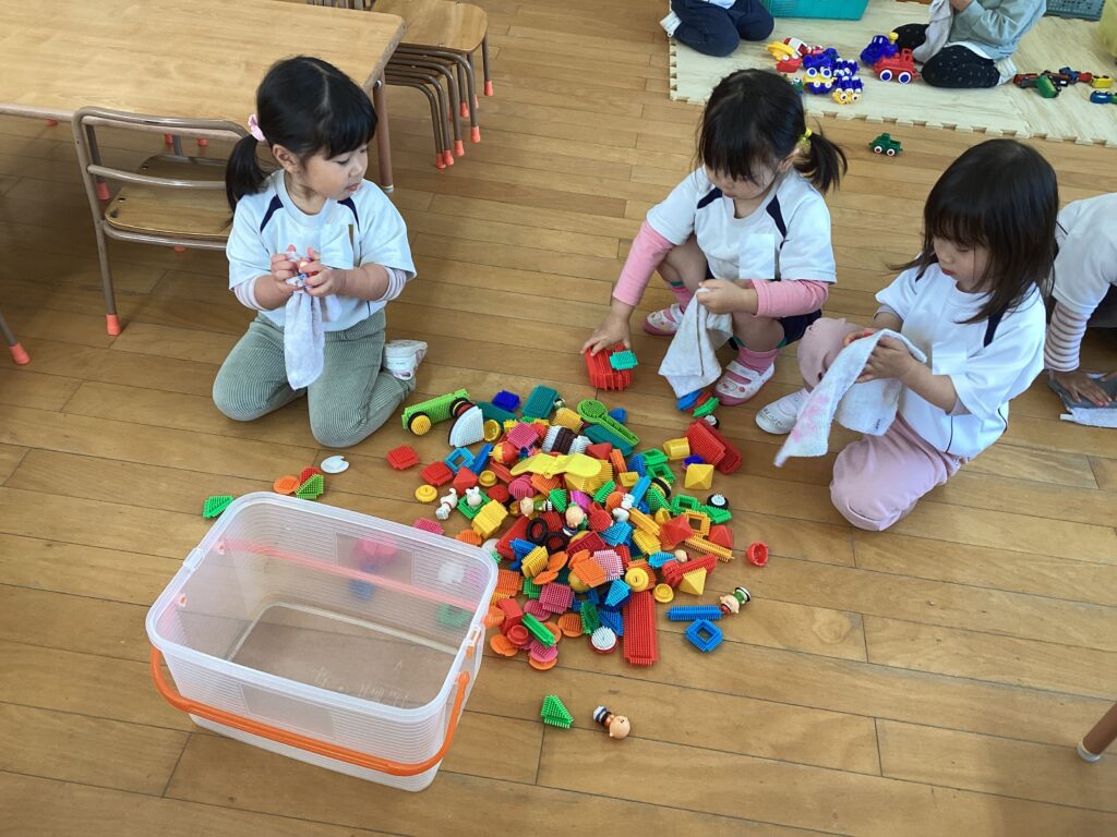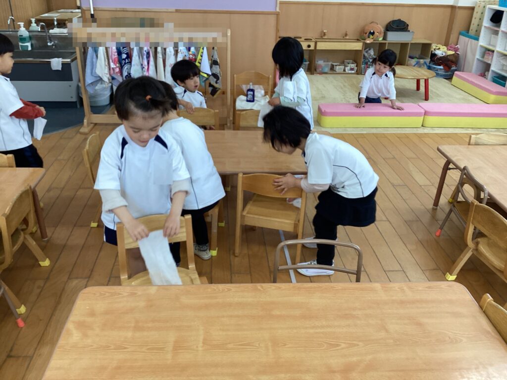 今日は一年間使ったおもちゃや椅子を、みんなでぴかぴかにしました!