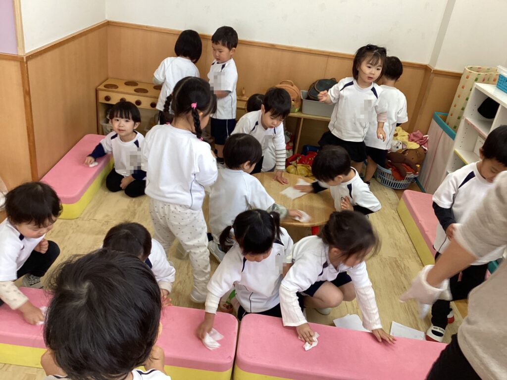 「ここきれいにする」と汚れているところを見つけたり、「こんなにきれいになったよ」と雑巾を見せてくれたり一生懸命頑張りました。