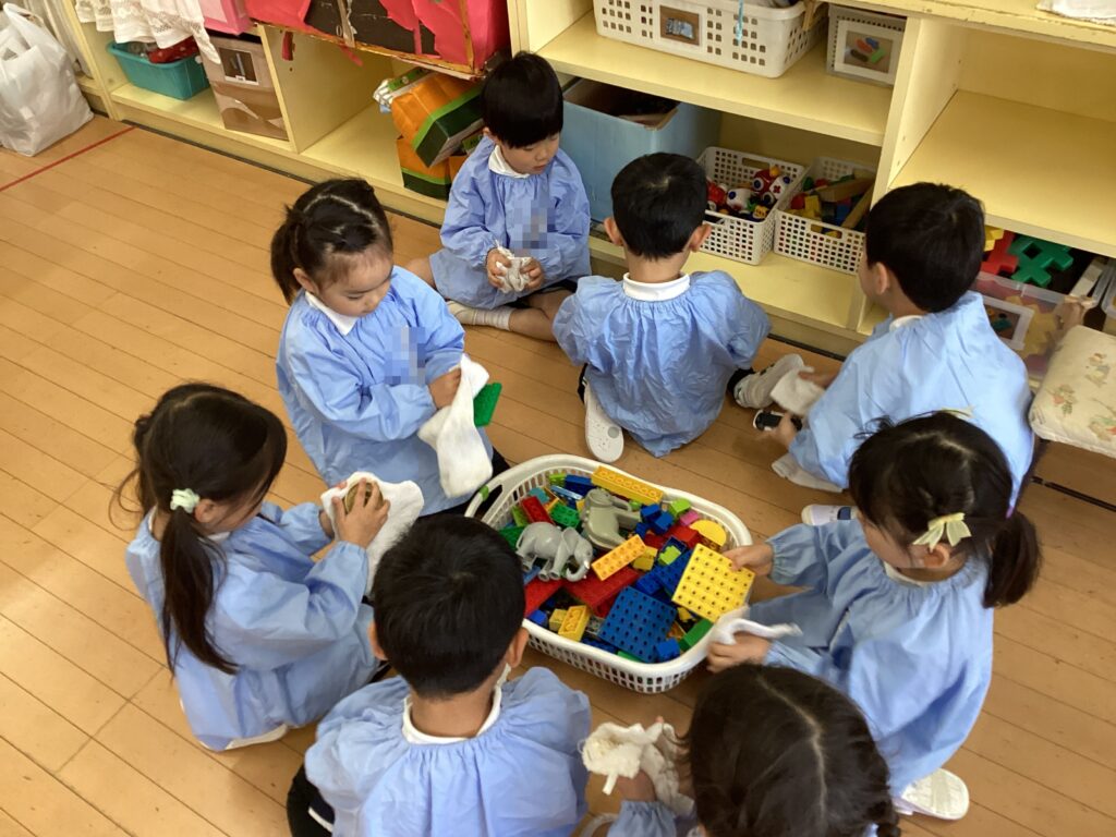 3月23日(月)に、1年間過ごしてきたお部屋や、楽しく遊んだおもちゃをみんなで拭いてきれいにしました。