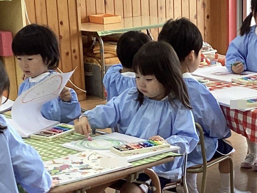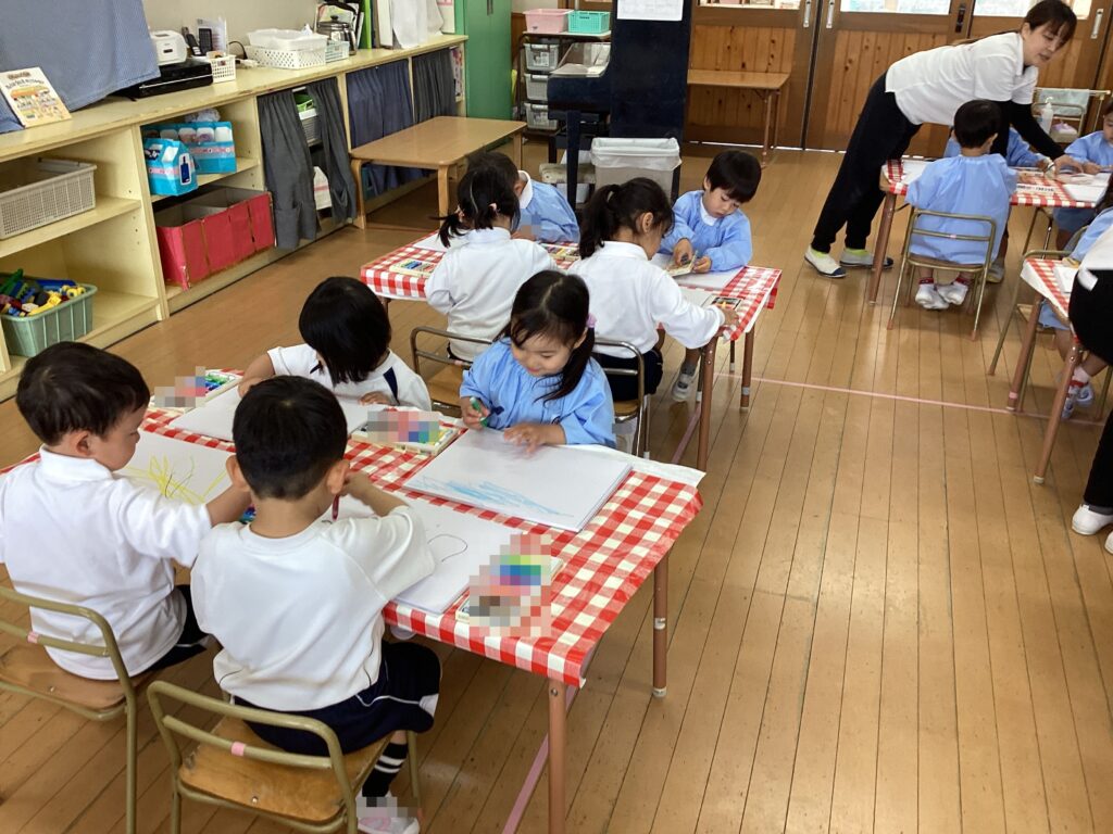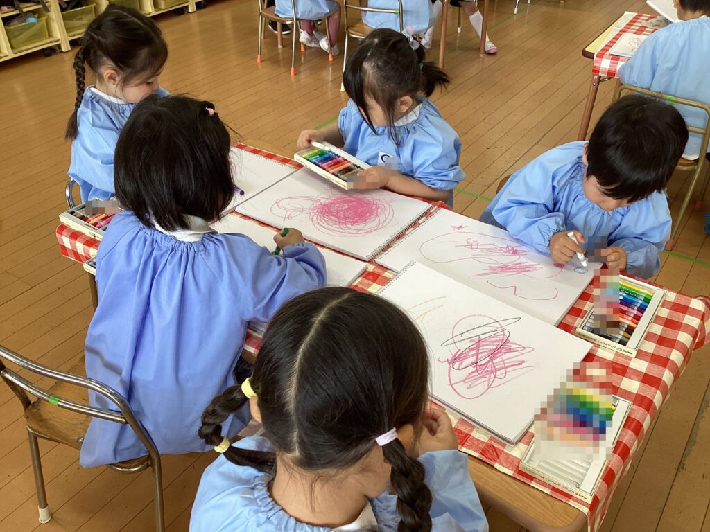 今日は初めてのクレヨンを使って自由画帳に思い思いに表現しました。「これはアンパンマン!」「みて!らいおんかいたの!」と教えてくれたり、クレヨンで描けた喜びが大きく「おうちのひとにみせたい!」との声も聞こえてきましたよ。これからも自由に表現する時間を大切にしながら絵を見て感じ、子どもたちとの会話もたっぷりと楽しんでいきたいと思います!