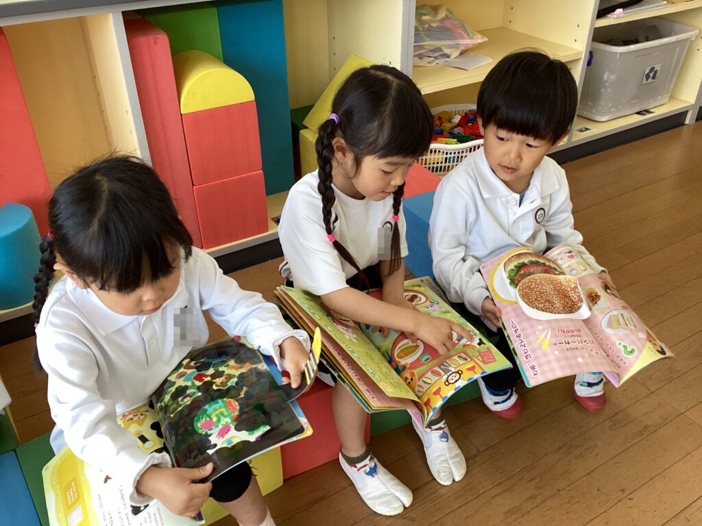 お友だちとシールを貼ったり、お話を読んだり、一緒に絵本を見ました。おいしそうなハンバーガーも作れたよ。