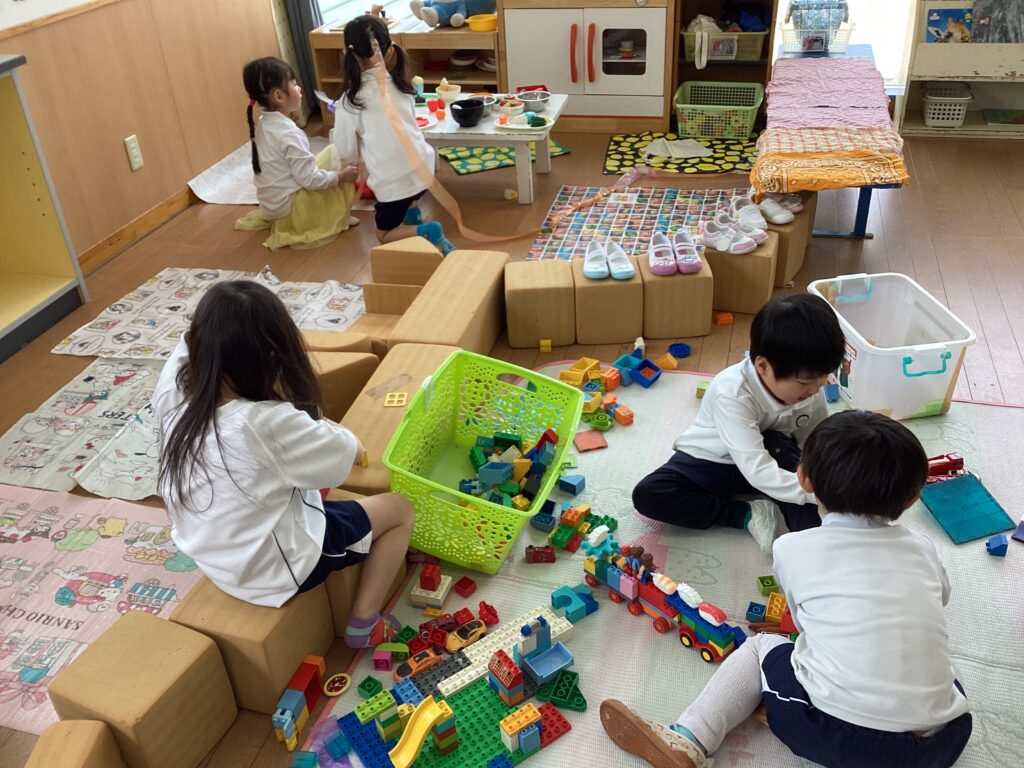 新しいお部屋やおもちゃになり、同じクラスだったお友だち、新しく出来たお友だちと好きな遊びを楽しみました。
