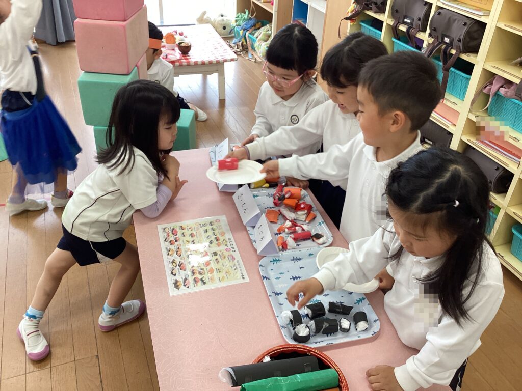色んなお寿司を作って、お寿司屋さんがオープン。お店屋さんやお客さんになりきってお寿司屋さんごっこを楽しみました。みんなが大好きなお寿司もあって嬉しかったね。