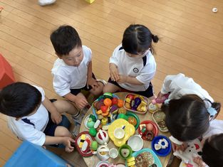 お部屋では、おままごとでお料理パーティーが始まりお友だちと一緒ににこにこ笑顔で遊ぶ姿や