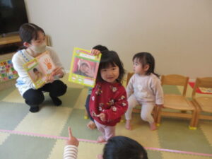 いつもとは違う様子に戸惑っていたいちご組さんでしたが、お膝の上に座ってふれあい遊びをすると笑顔も見られました。お母さんお父さんやおばあちゃんと一緒に過ごせて嬉しかったね😊