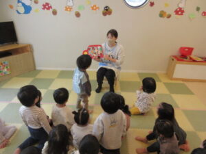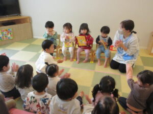 一緒におやつを食べたり手遊びをしたり、「バスにのって」や「できちゃった」などのふれあい遊びをしたりしました。