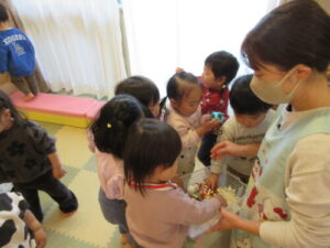 一緒におやつを食べたり手遊びをしたり、「バスにのって」や「できちゃった」などのふれあい遊びをしたりしました。