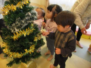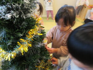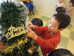 好きなオーナメントを選び、保育園のクリスマスツリーを飾り付けました!