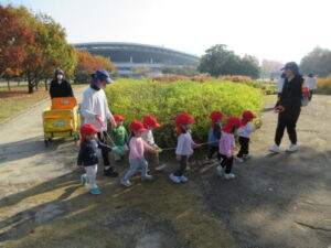 どんぐり・落ち葉拾いをして真剣に自分のバッグへ集めていました。