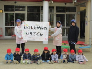 先生からのお楽しみは「おべんとうバス」でした。バスにどんな食べ物が乗ってくるかな?とみんなで一緒に考えながら楽しみました。