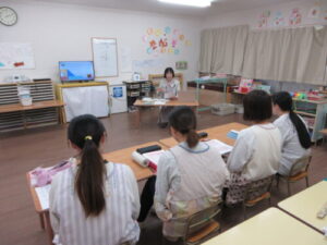 今回は始めに二学期に行った英語活動での子どもの様子を佐藤先生とつしま幼稚園の2歳児クラスの担任と話し合いました。成長した姿、楽しんでいた歌やお話、難しいと感じた内容などクラスの様子を聞いていただきました。担任の話を聞き各クラス2歳児らしい姿や興味の違いなどを感じたり難しいと感じた内容については佐藤先生から2歳児に合わせた指導方法のアドバイスをいただき、貴重な時間となりました。
