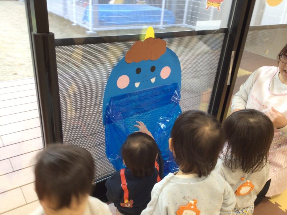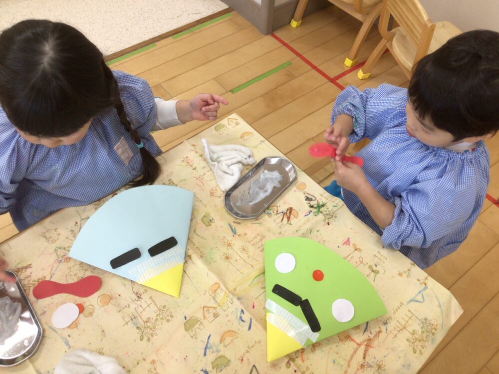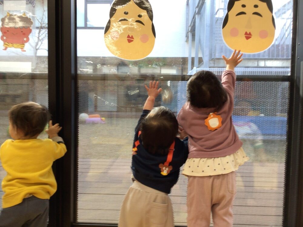 鬼が苦手で節分会が来ないでほしいお友達もいますが、自分たちの作った鬼の被り物と升を早く使いたいようで、怖いけど楽しみにも思っているようです。