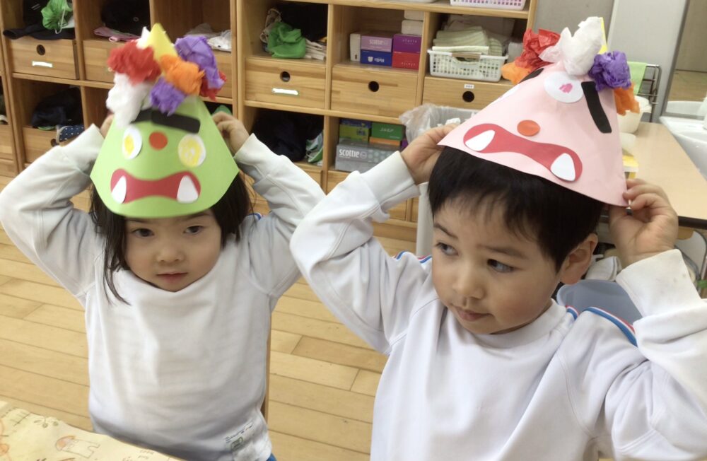 今週は、節分会に向けて鬼の被り物と升を作りました。鬼の被り物は、子どもたちが家で選んで持ってきた紙袋を使って作りました。柄のあるものや様々な色の鬼が完成して、子どもたちが被るととても可愛かったです!