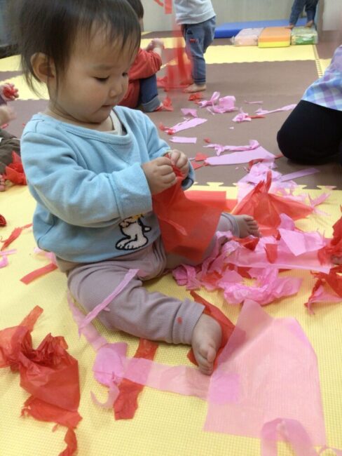 ビリビリと破る音や感触、指先を動かすことを楽しんだりしました。