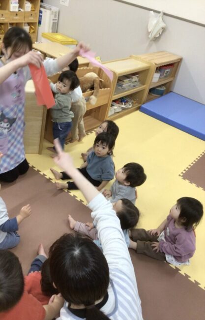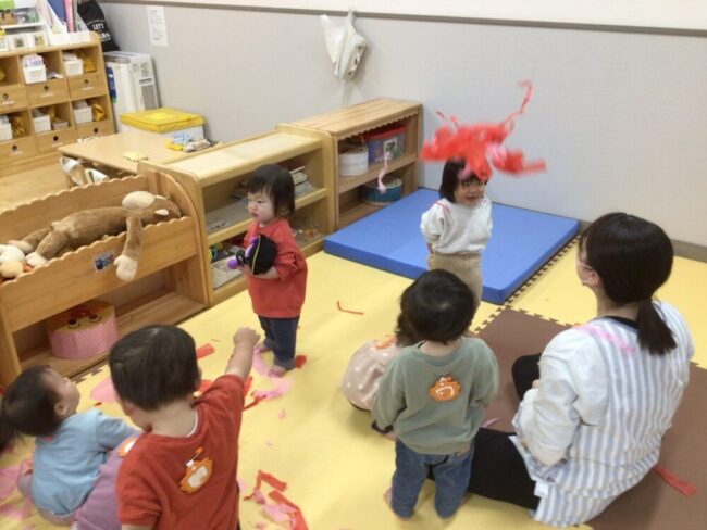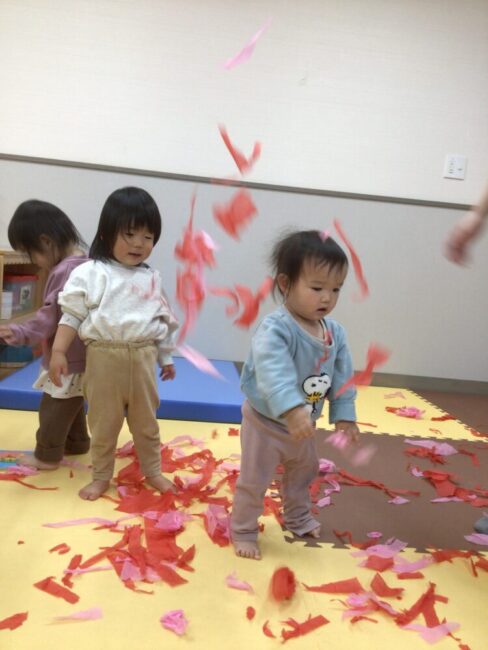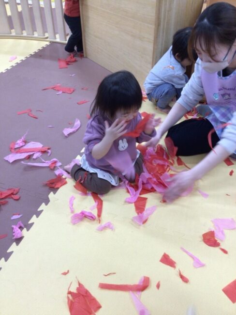 たくさん破った花紙は、雨のように降らせると「キャー!」と喜ぶ顔がとても可愛いかったです![]()