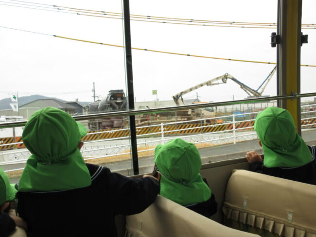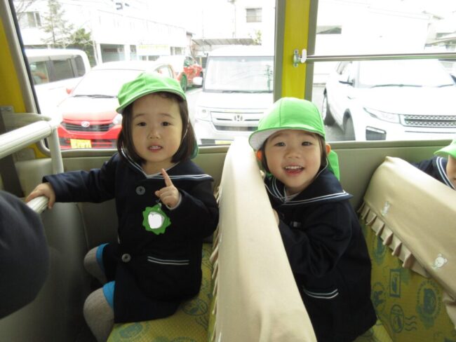 「ばすにのってゆられてる♪」歌をうたったり、運転手さんがクイズを出してくれたりしていると、あっという間に園に到着!