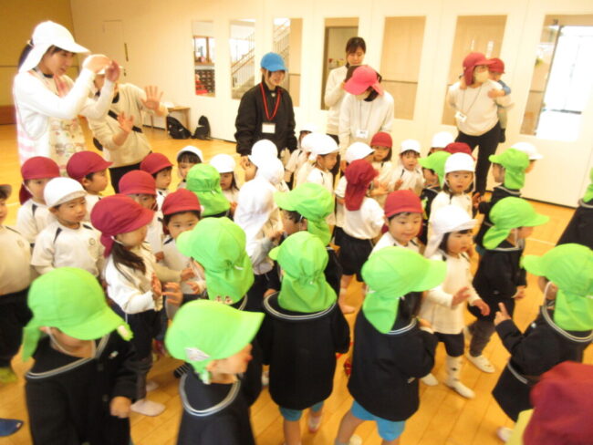 ホールに行くと、こども園の園庭で遊んでいたあんず組さんたちがホールで待ってくれていました![]()