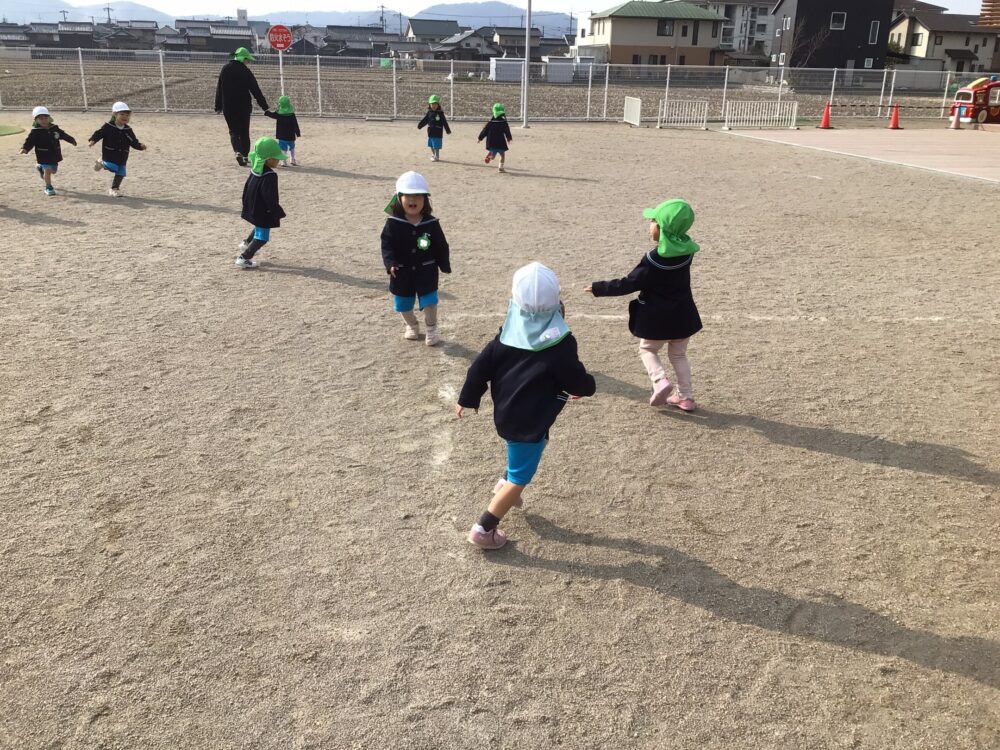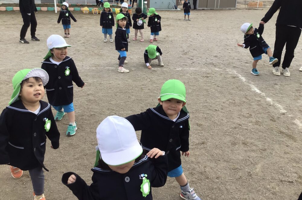 「だるまさんがころんだ!」と先生が振り向くと、ピタッと止まったりにこにこでちょっとずつ進んだり…