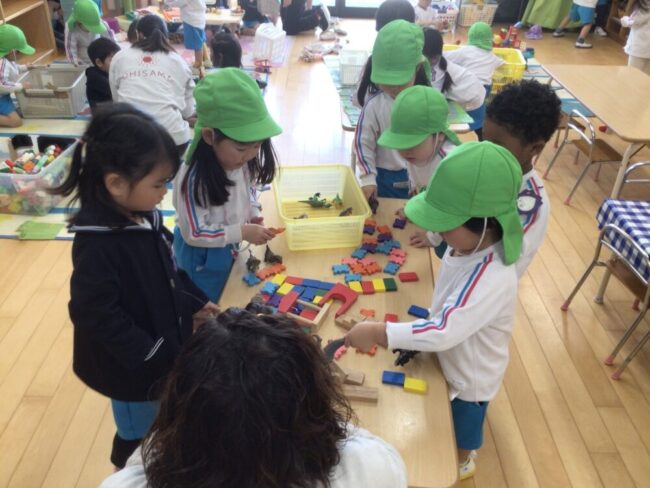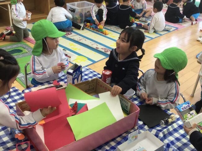 お友だちと協力して、キャップのシールとケースのそこに貼っているシールの同じところを探して、パズルを完成させています!