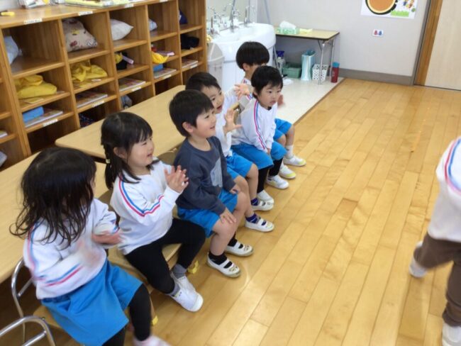 3歳さんは、「だーいすき」4歳さんは「1年生おめでとう」のお歌を歌いました。
