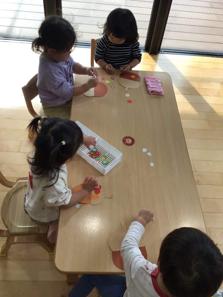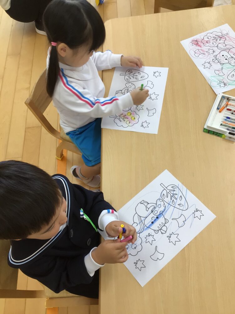 塗り絵やどんぐり探しなど、秋にちなんだ遊びを楽しんでいます!