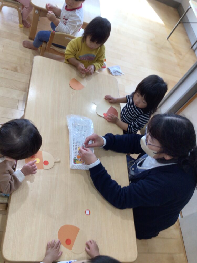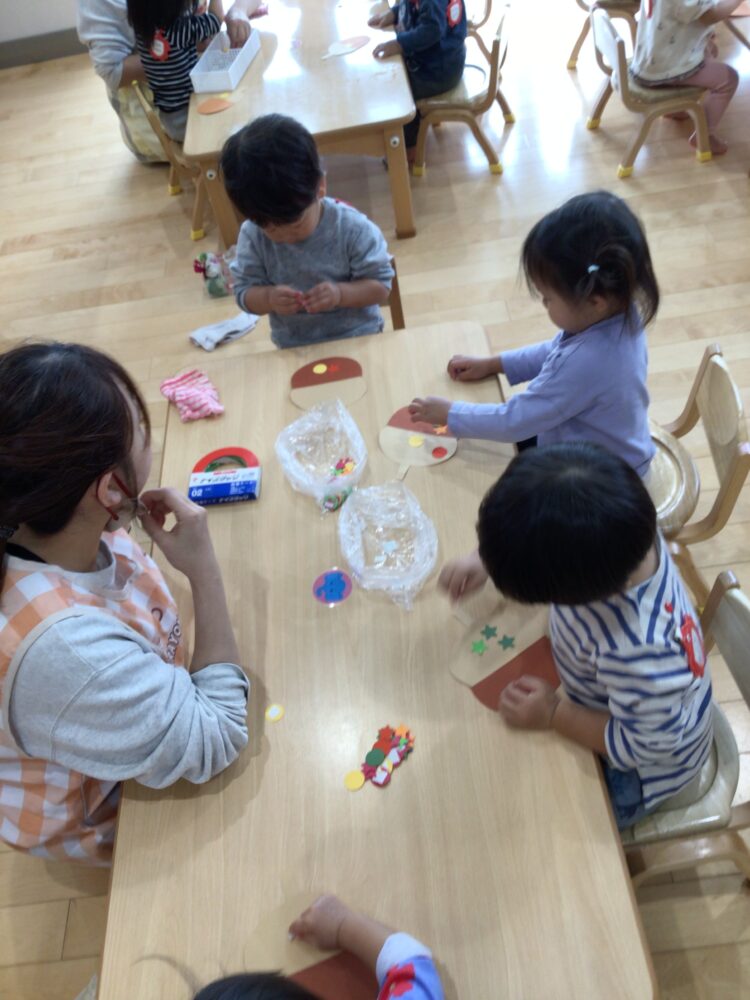 指先が器用になってきたいちご組さんです。両面テープを剥がしてペタッと貼るのが上手になってきています✨