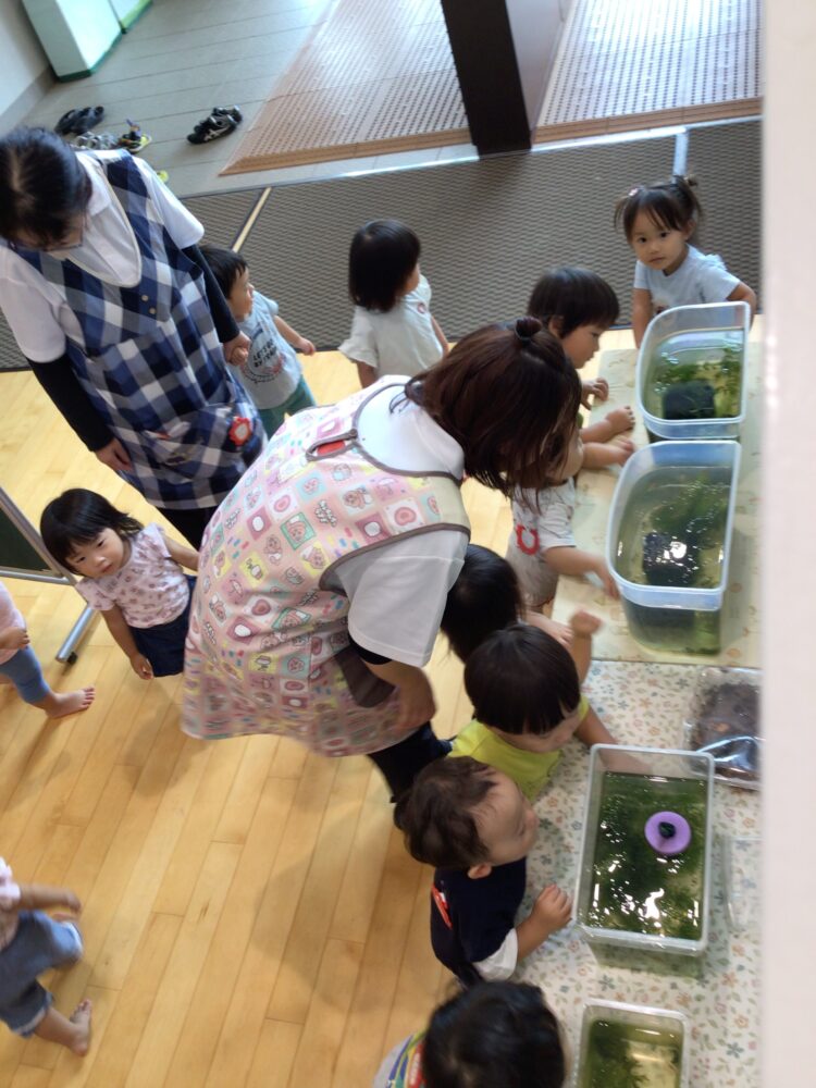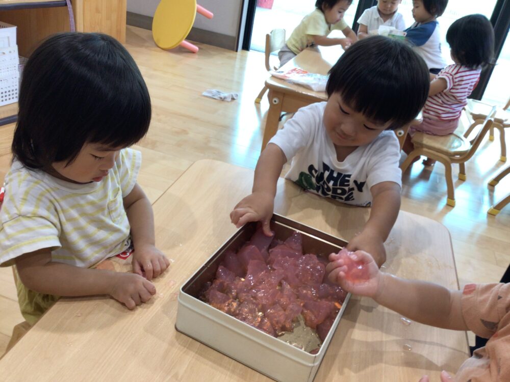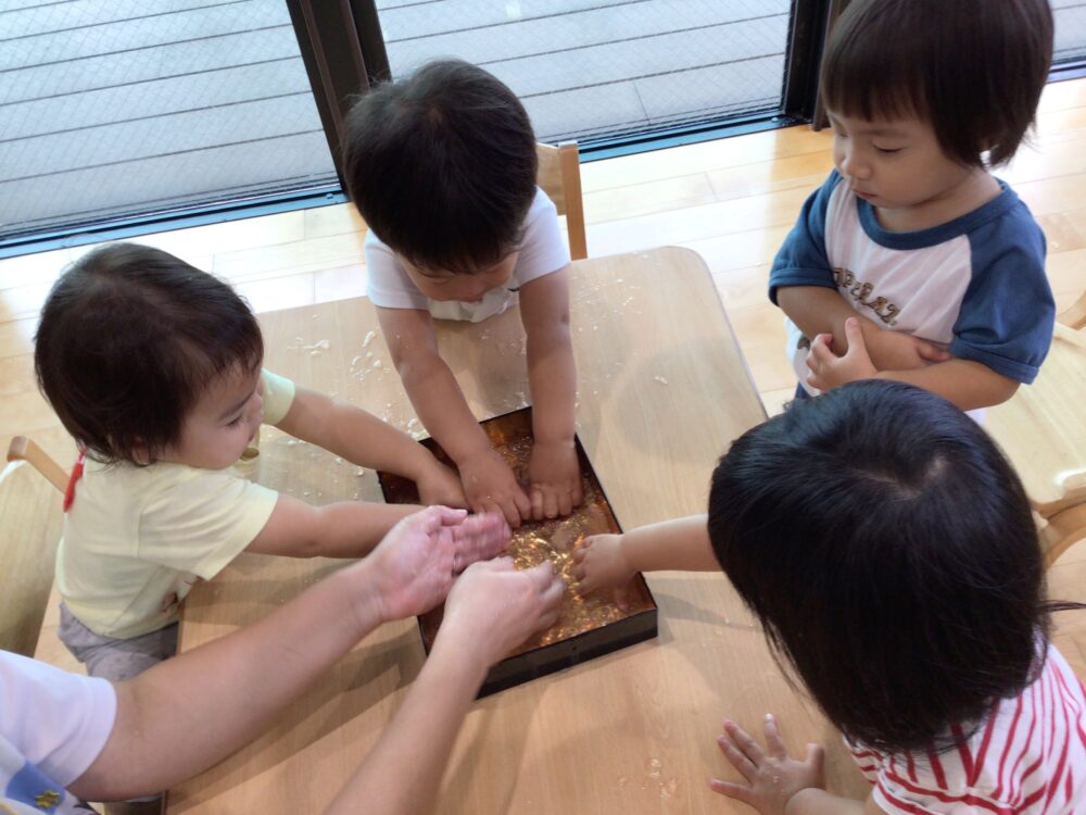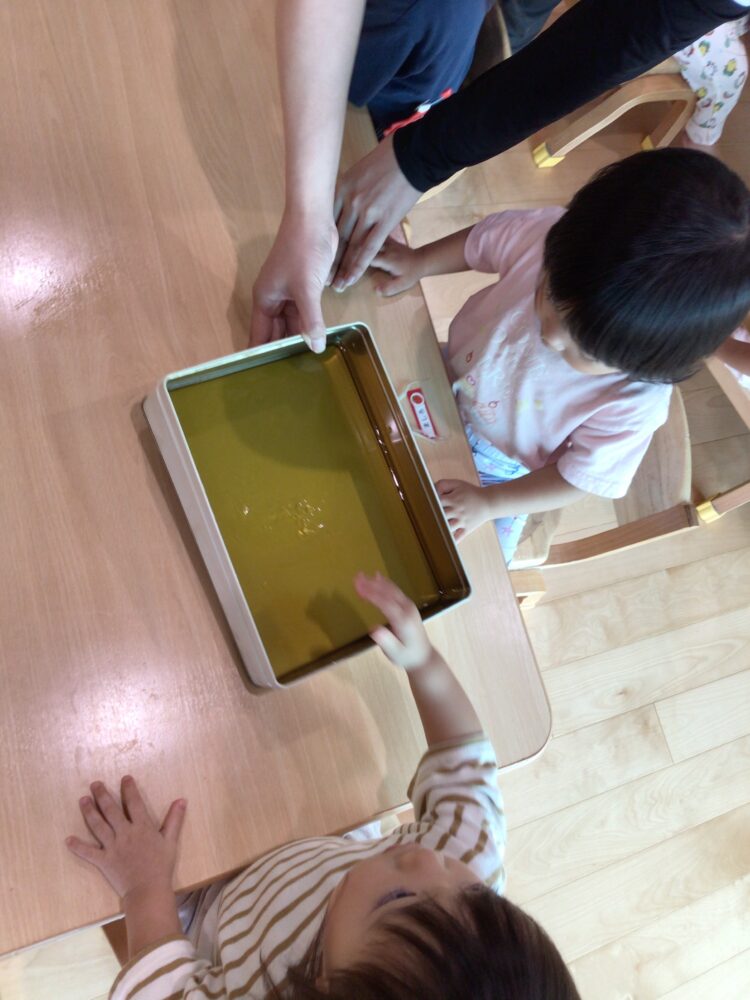 初めて触る感触にびっくりしていましたが、段々と気持ちがいいことに気づいて、感触遊びを楽しめました