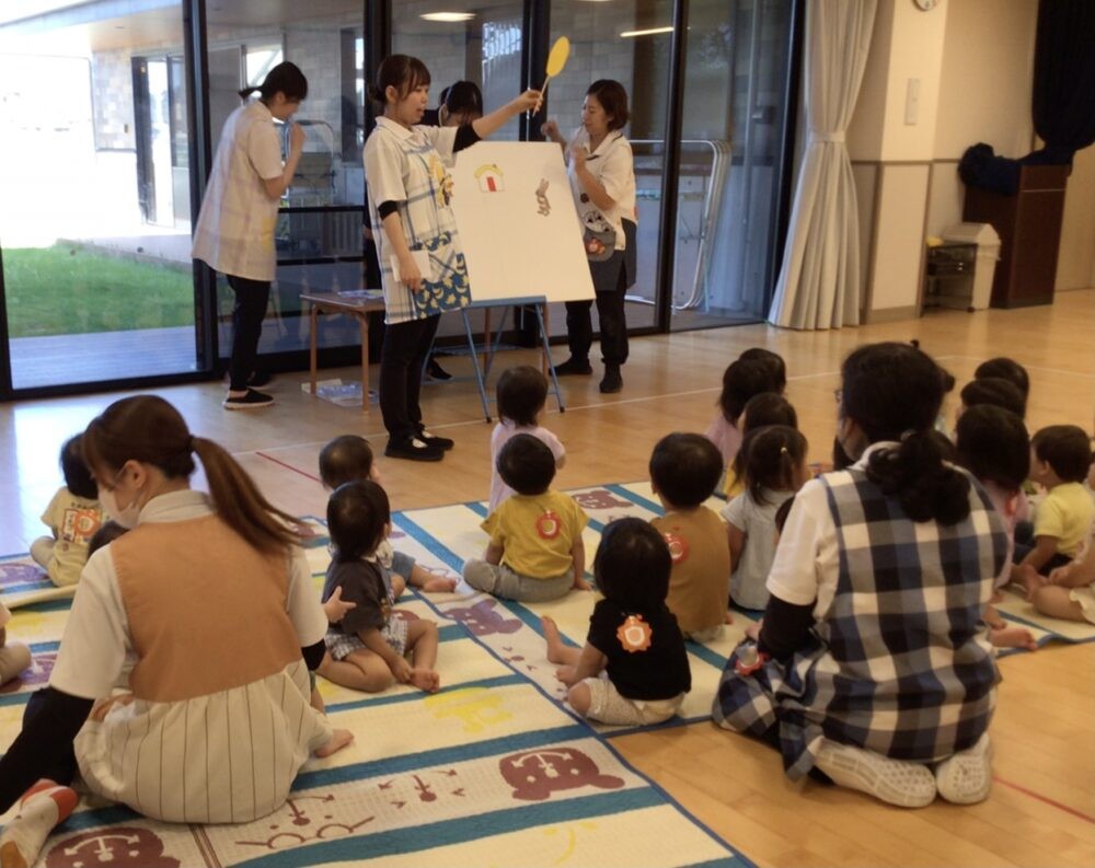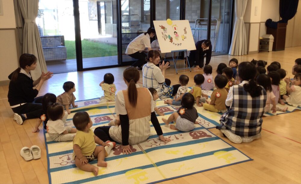 手遊び「げんこつ山のたぬきさん」や、お月さまの由来のお話を上手に聞いています。