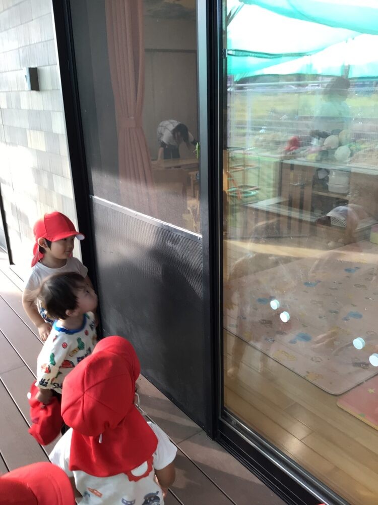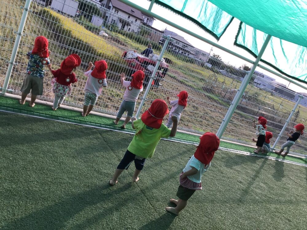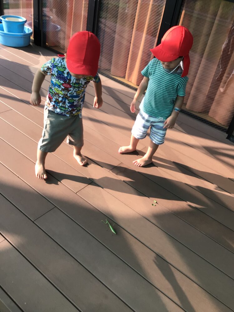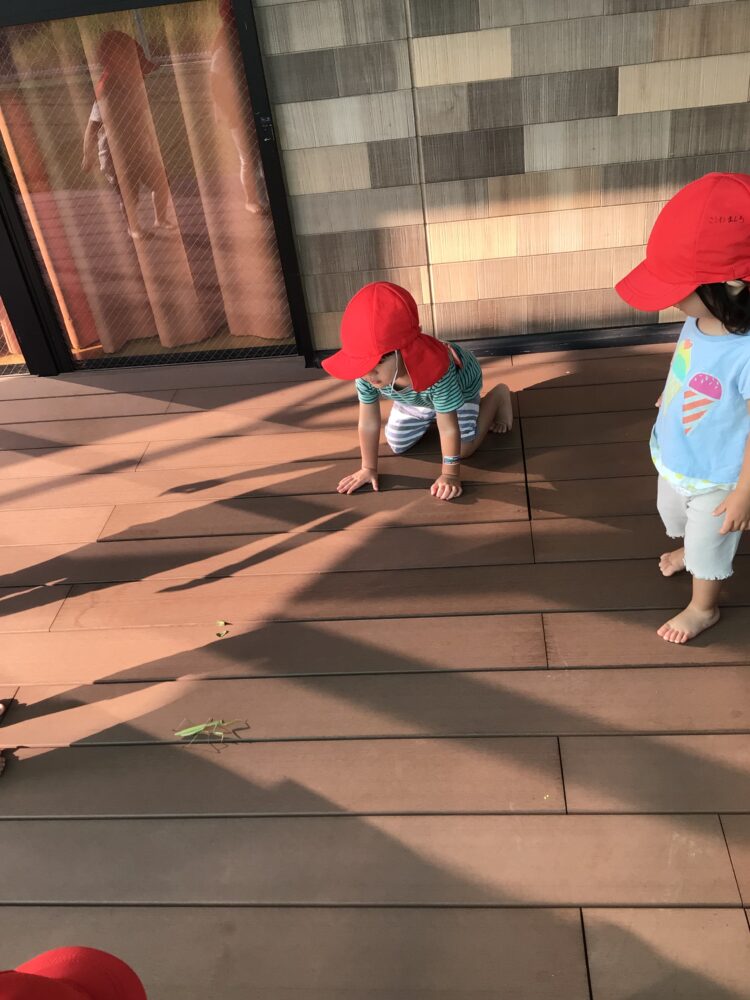 お外遊びが大好きないちご組さんは、お外に出るとカマキリやバッタを見つけて大喜びです![]()